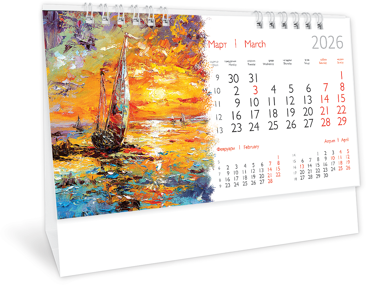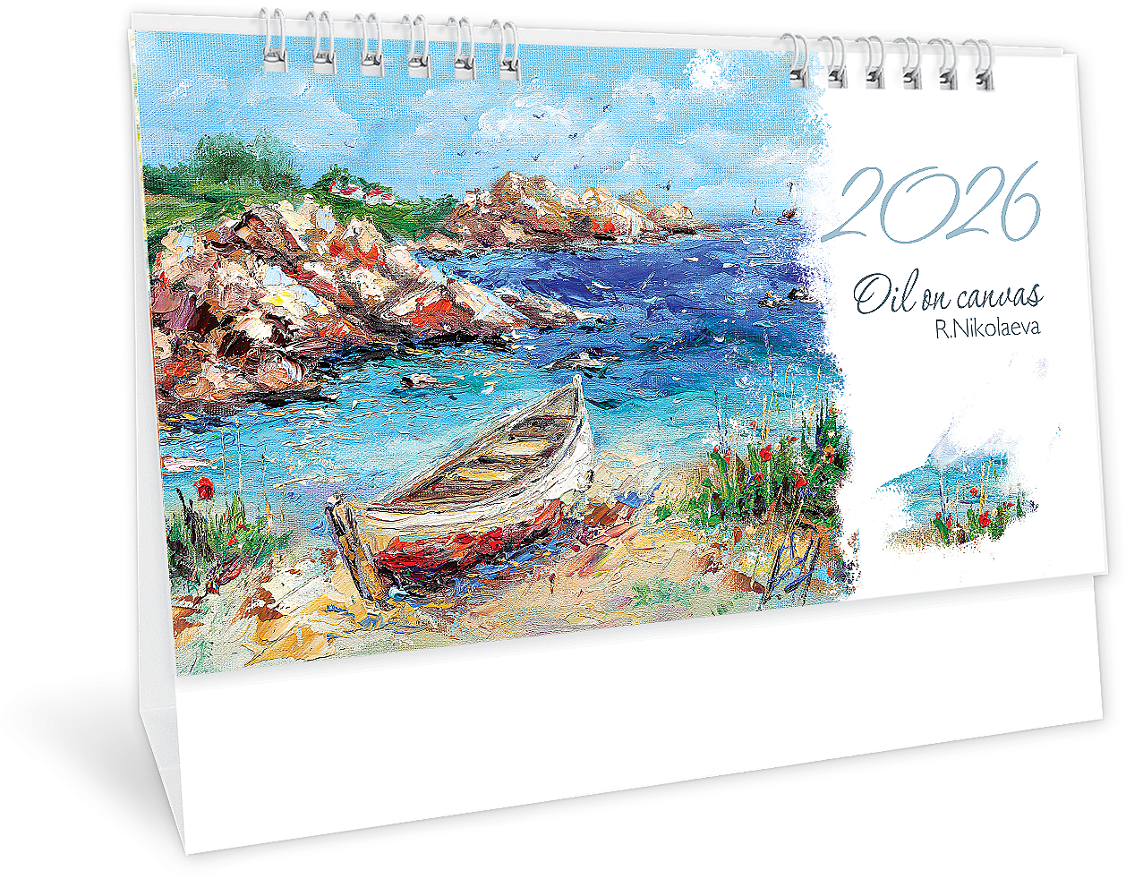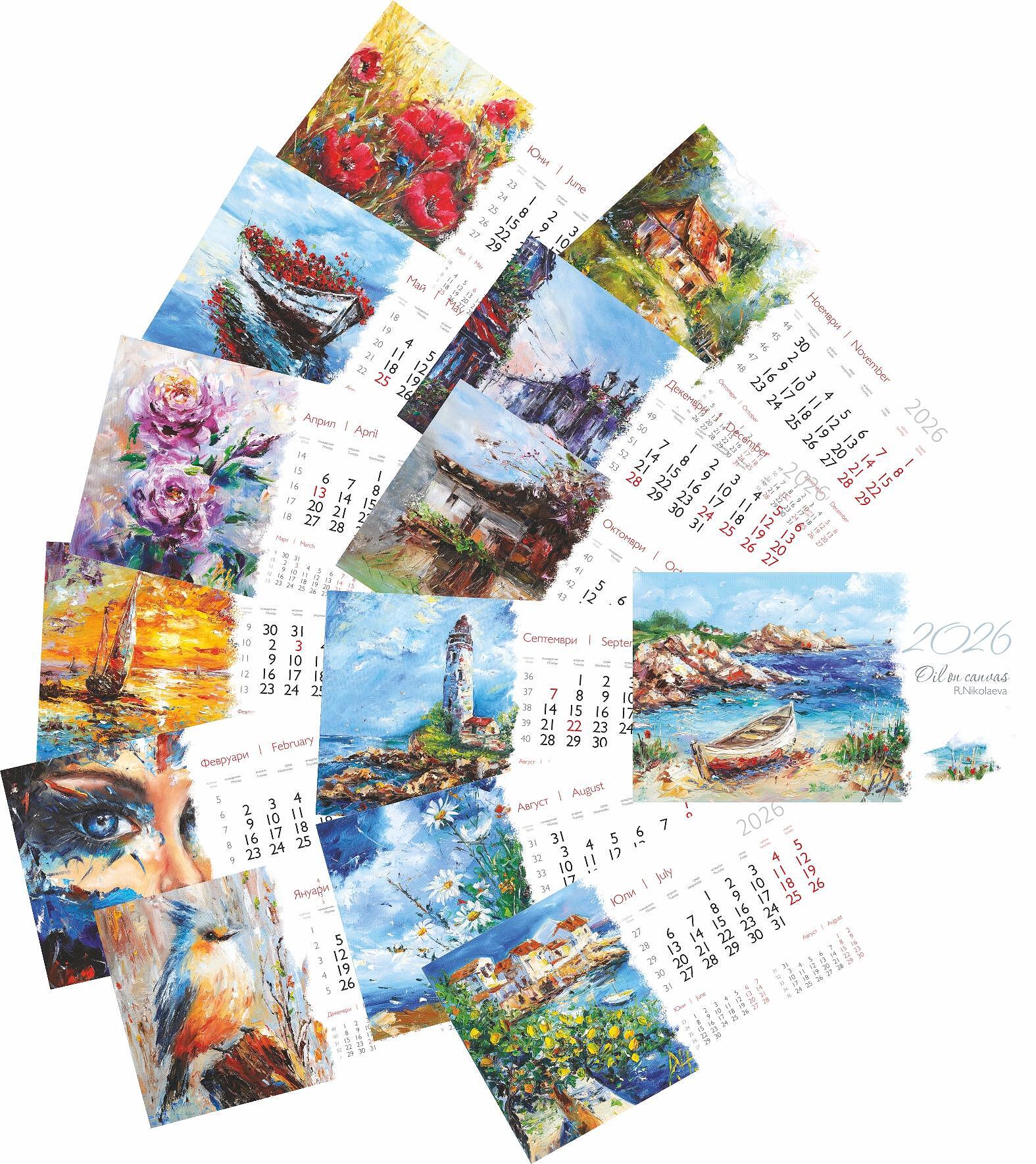 Настолна пирамидка със спирала: Маслена живопис -13 листова с картини на лицето и гърба на всеки месец.