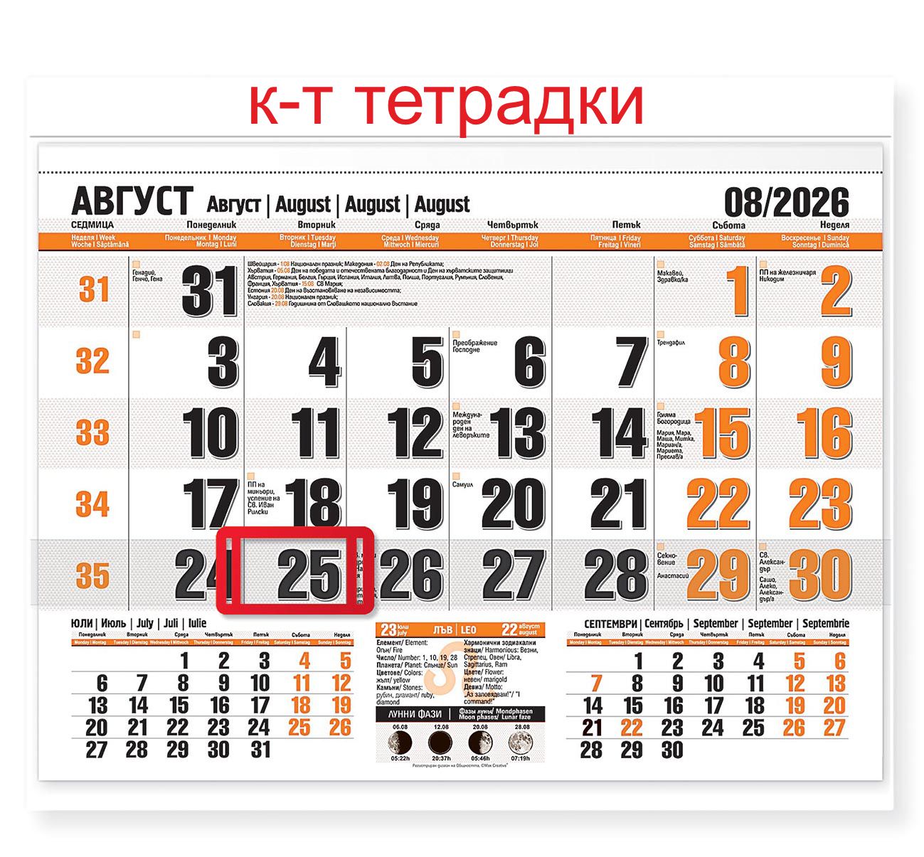 Тетрадка: Комплект от две секции. Първата секция е същата като на модел Единица класик. Втората секция е с подробна информация за празниците. Офсет 70 г, печат в 2 цвята, с перфорация и бандерол, български и английски език, прозорче за текущия ден. ( НЕ Е ВКЛЮЧЕНО В ЦЕНАТА ) - ПОРЪЧАЙ ТУК Отбелязани са именните дни и фазите на луната.