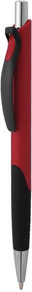 Пластмасова химикалка с щракащ механизъм, син пълнител за писане и широк бял клипс, подходящ за брандиране.