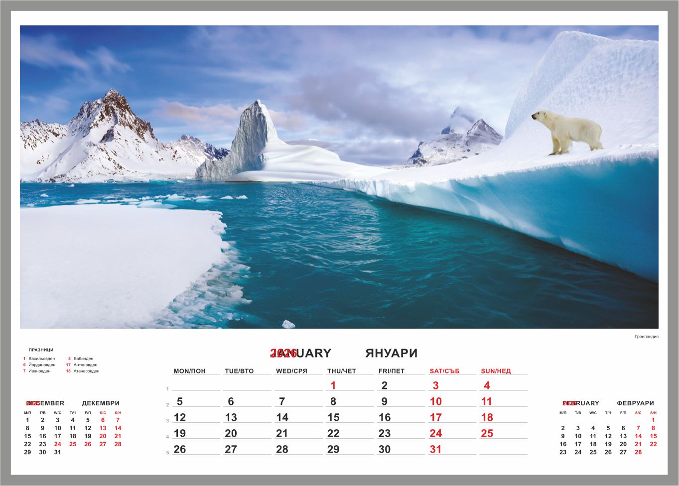 Тяло: хром-мат 150 г формат: 48 х 34 см корица: UV-лак Гръб: финландски картон 400 г размер: 48 х 38 см рекламно поле: 48 х 4 см Национални празници на България, Германия, Франция, Великобритания и Нидерландия.