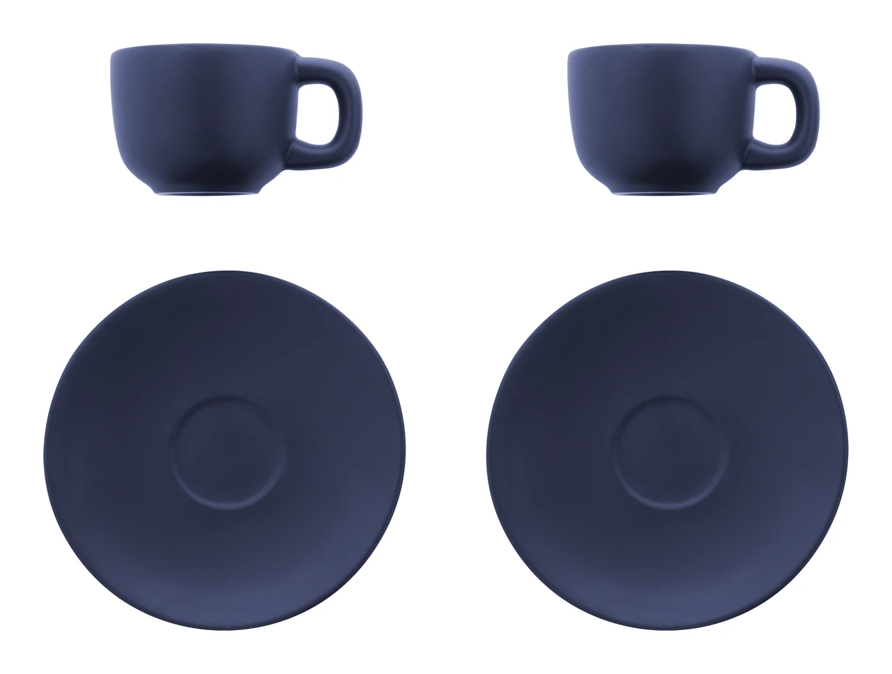 Висококачествен керамичен комплект еспресо чаши, включващ 2 чаши и чинийки. Матова външна и гланцова вътрешна повърхност. Опаковка: кутия от kraft хартия. Вместимост: 85 ml.