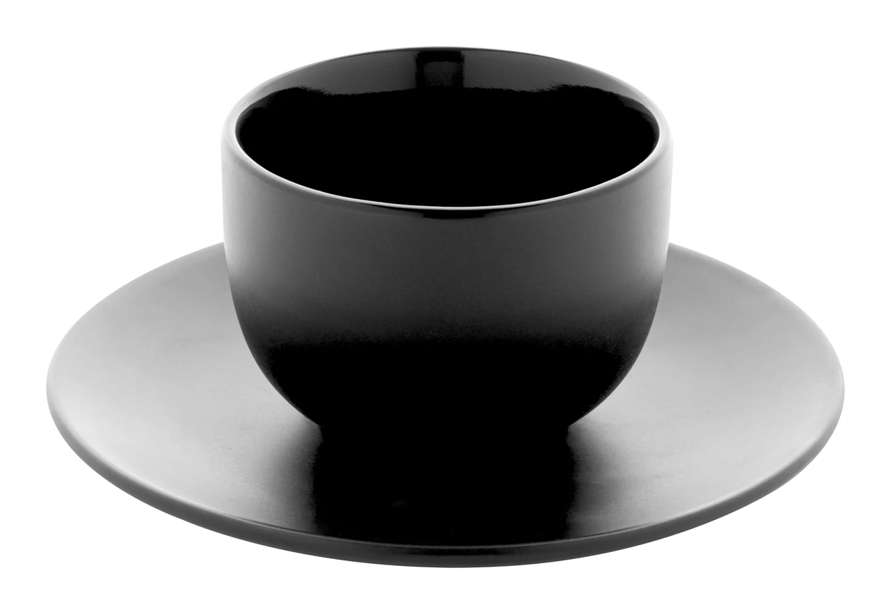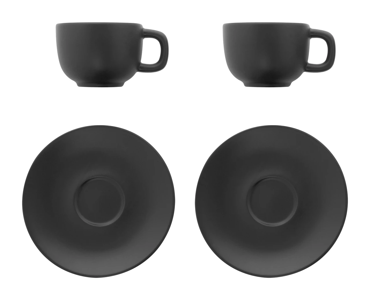 Висококачествен керамичен комплект чаши за капучино, включващ 2 чаши и чинийки. Матова външна и гланцова вътрешна повърхност. Опаковка: кутия от kraft хартия. Вместимост: 85 ml.