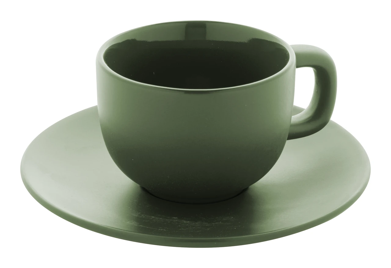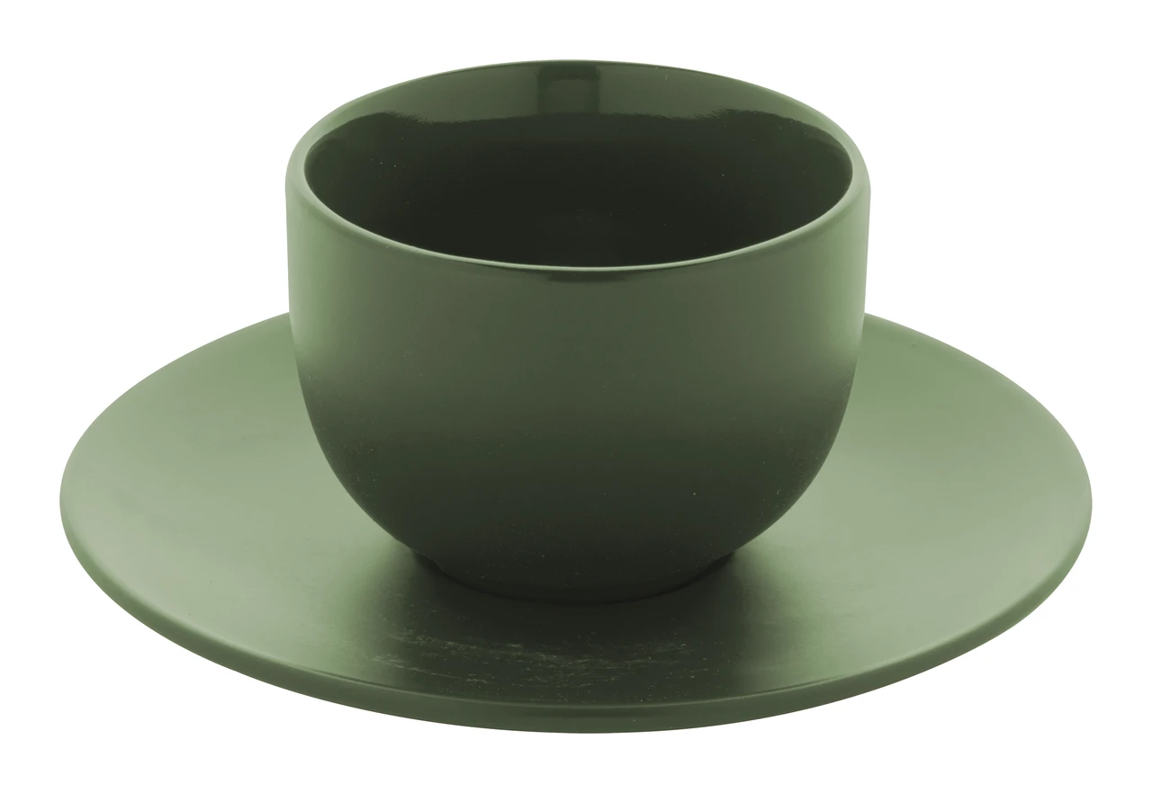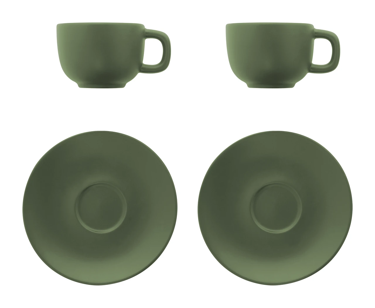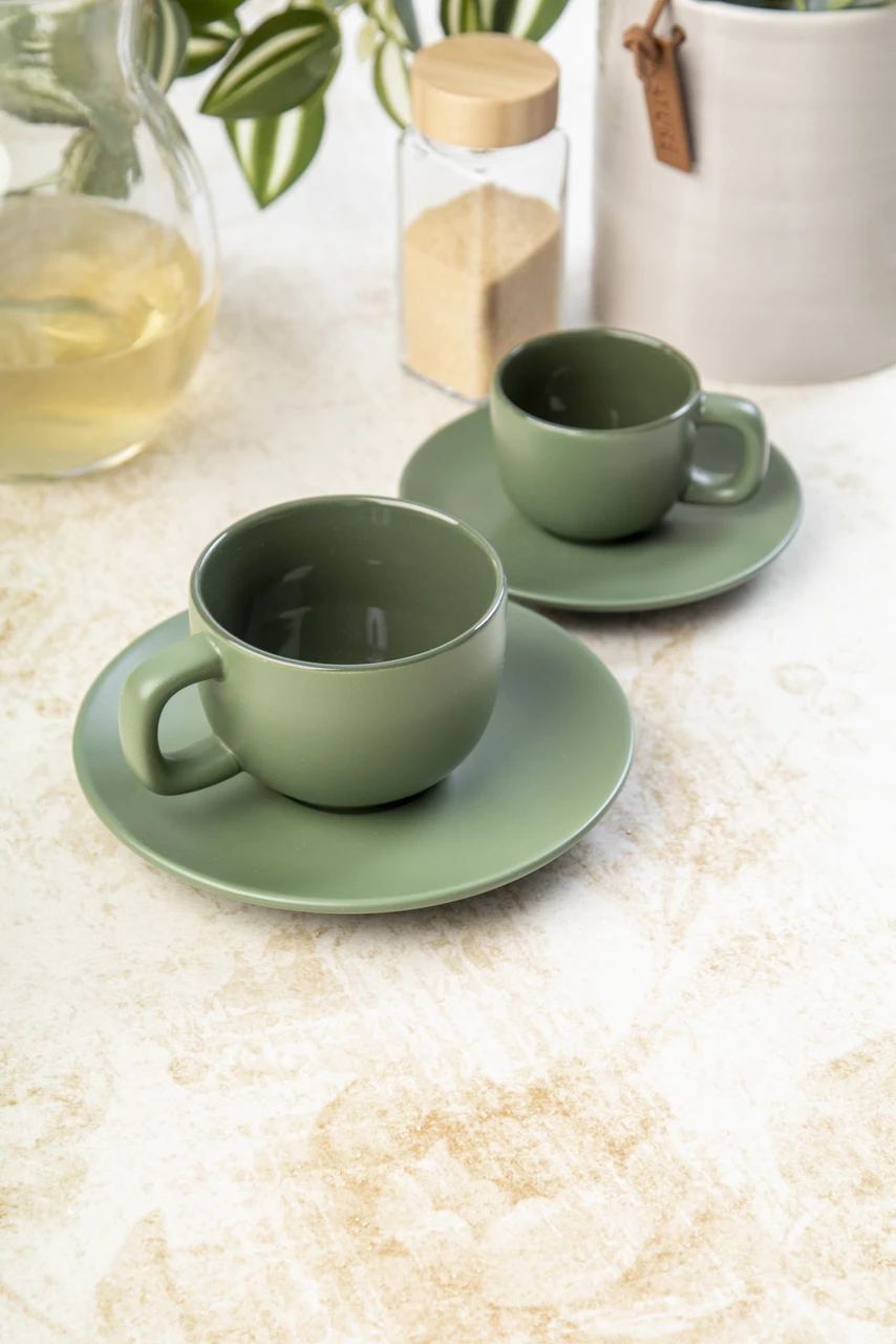 Висококачествен керамичен комплект чаши за капучино, включващ 2 чаши и чинийки. Матова външна и гланцова вътрешна повърхност. Опаковка: кутия от kraft хартия. Вместимост: 85 ml.