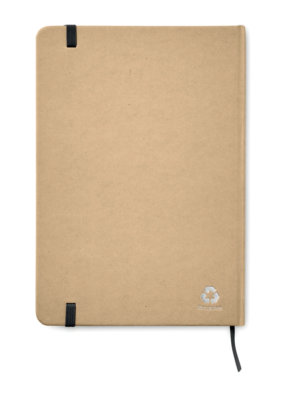 Екологичен бележник A5 с твърда корица от рециклиран картон. Съдържа 160 страници (80 листа) с редове, изработени от рециклирана хартия. Включва еластична лента за затваряне и маркираща лента. Перфектен за ежедневни бележки, идеи и записки.