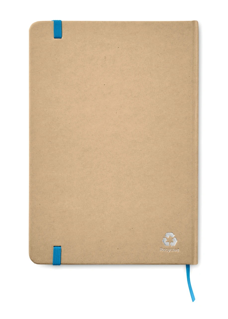 Екологичен бележник A5 с твърда корица от рециклиран картон. Съдържа 160 страници (80 листа) с редове, изработени от рециклирана хартия. Включва еластична лента за затваряне и маркираща лента. Перфектен за ежедневни бележки, идеи и записки.