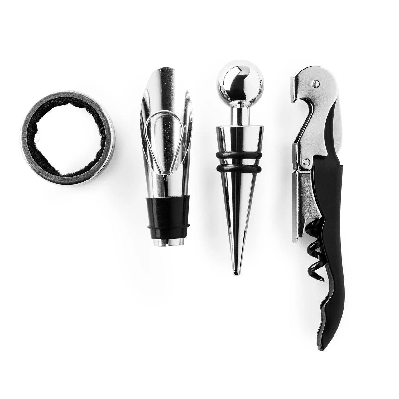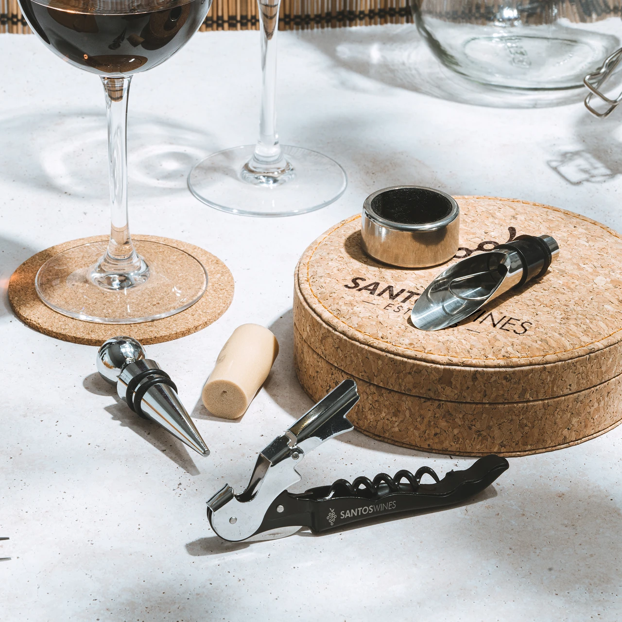 Елегантен комплект за вино с аксесоари от неръждаема стомана. Включва тирбушон, пръстен против подливане, ливка и тапа. Всички елементи се съхраняват в кутия от естествен корк с меко вътрешно покритие.