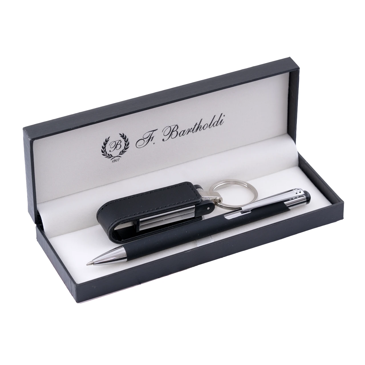 Луксозен комплект съчетаващ метална химикалка с гумирано покритие и USB кожена флашка с капацитет 32GB.