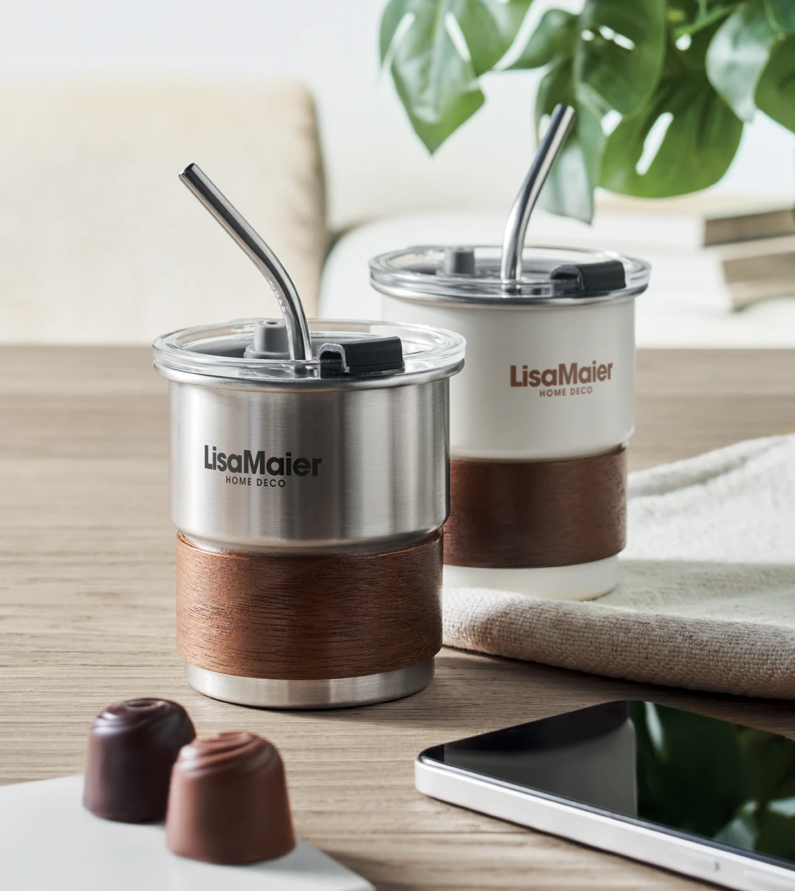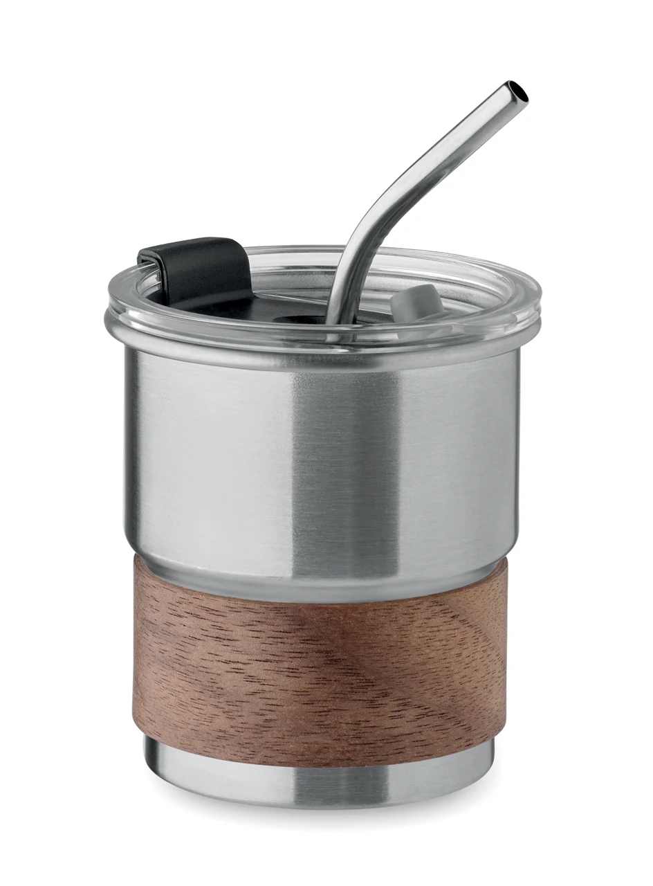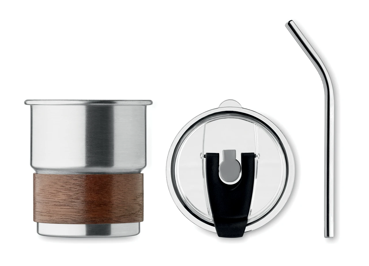 Едностенна чаша от неръждаема стомана с подвижен захват от акациево дърво и сламка от неръждаема стомана. Място за сламка и директен отвор за пиене, непропусклив капак. Вместимост: 260 мл. Тъй като това е едностенна чаша е възможен пренос на топлина.