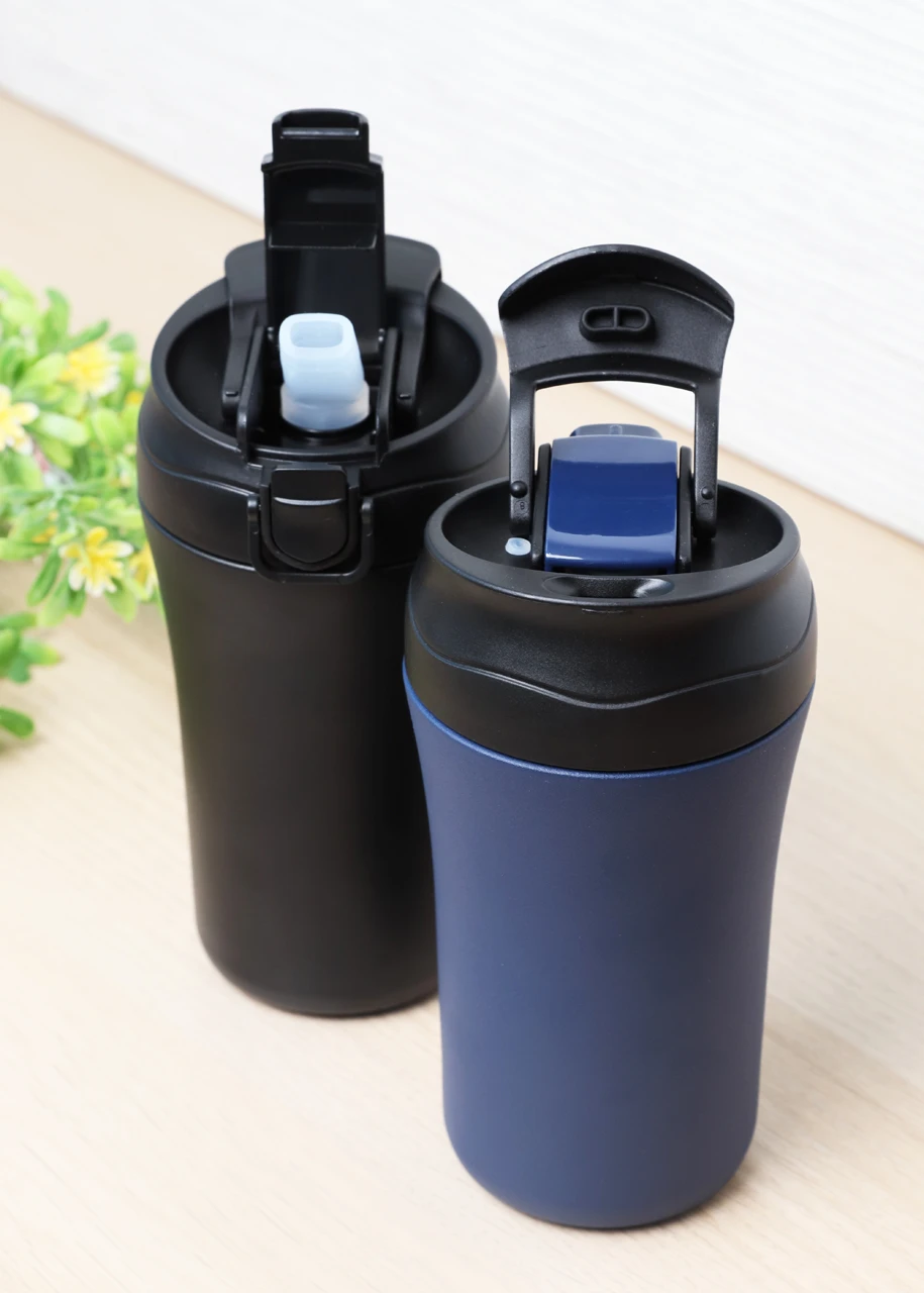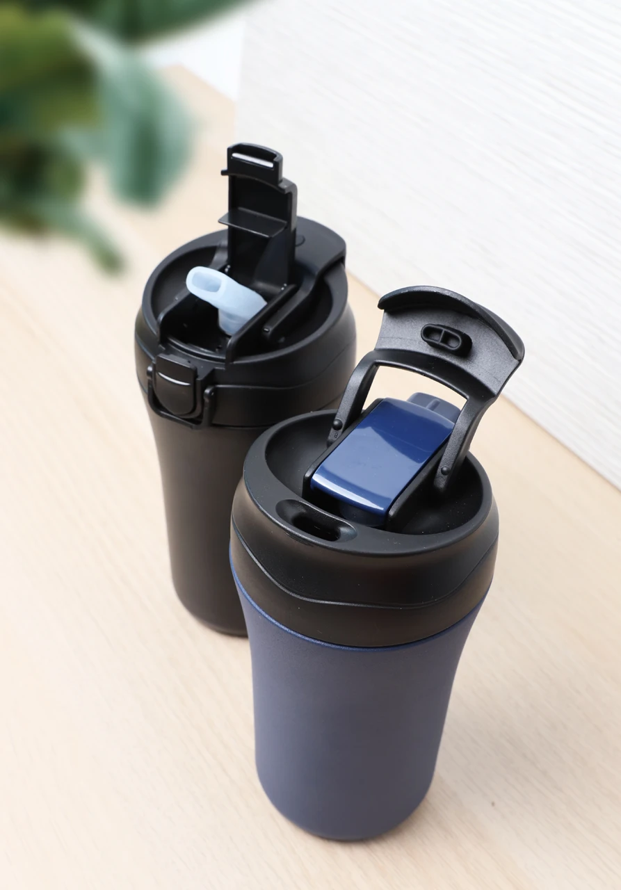 Термочаша от неръждаема стомана с двустенна изолация, която поддържа напитките топли или студени за дълго време. Капакът е снабден с бутон за лесно отваряне, заключващ механизъм и предлага два начина на употреба – сгъваема сламка или отвор за пиене. Компактният размер и удобната форма я правят практичен избор за път, офис или ежедневие.