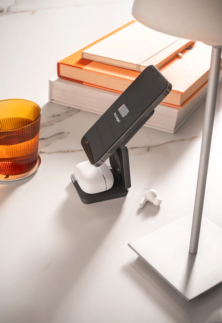 Компактно сгъваемо зарядно устройство за едновременно зареждане на до три устройства: смартфон (15W), слушалки (5W) и часовник (2,5W). Изработено от 100% рециклирана ABS пластмаса, с магнитна плоча за стабилно закрепване на телефона. Включва USB-C кабел и допълнителен магнитен пръстен за устройства без вграден магнит. Доставя се в еко-опаковка от крафт хартия