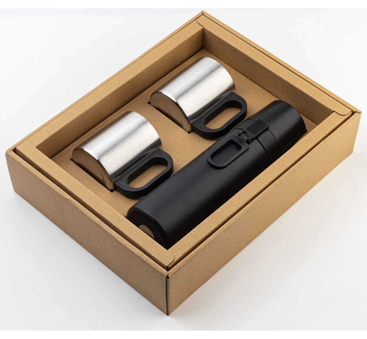 Комплект термос (500 ml) и чаши (200 ml) в картонена кутия . Материал: неръждаема стомана и пластмаса. Размер чаша: Ø70х82 mm. Размер термос: Ø65х240 mm. Печатаемо поле чаша: 40х40 mm. Печатаемо поле термос: 45х45 mm. Печат: тампонен, гравиране.