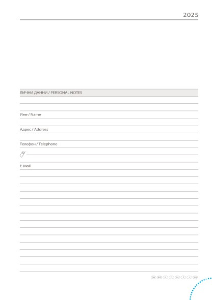 С дати. Мултинационално тяло, осем езика вкл. български, заглавна страница, официални и църковни празници в България и 24 страни. Хартия бял офсет. Текстилна лента за отбелязване. Перфорация на ъглите.