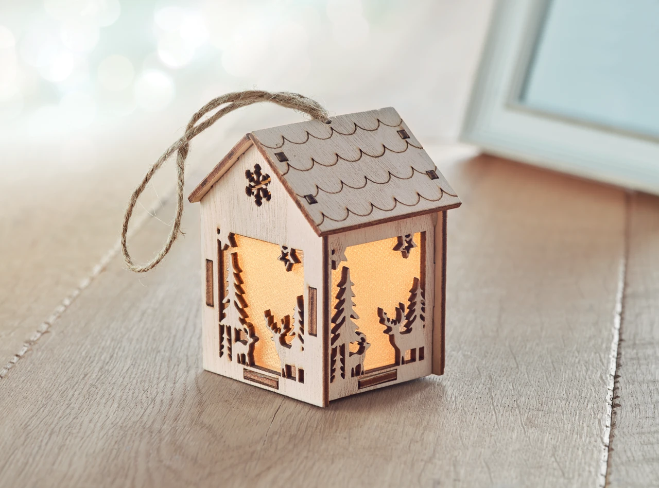 къщичка, декорирана от MDF, със светеща вътрешна светлина, коледни орнаменти и висящ шнур.