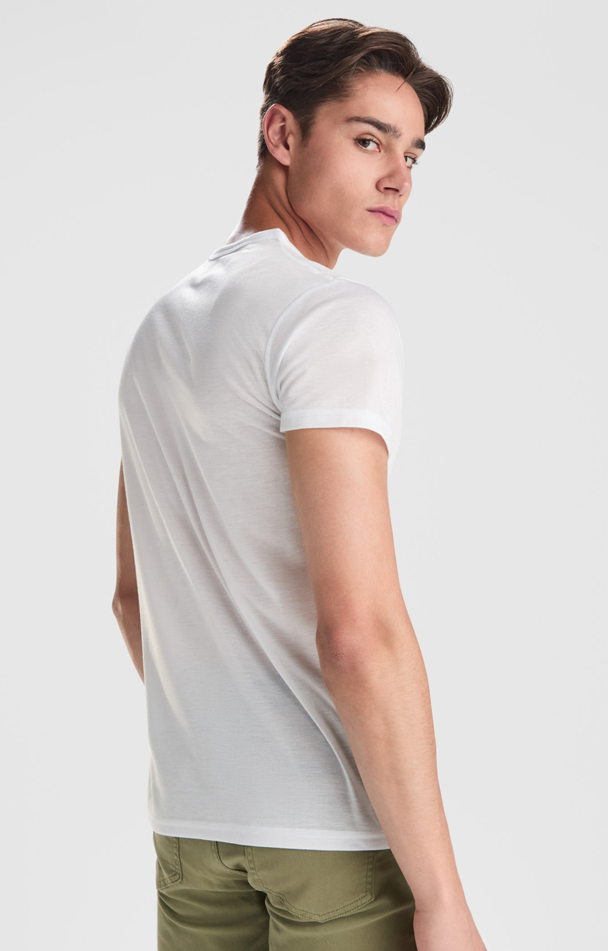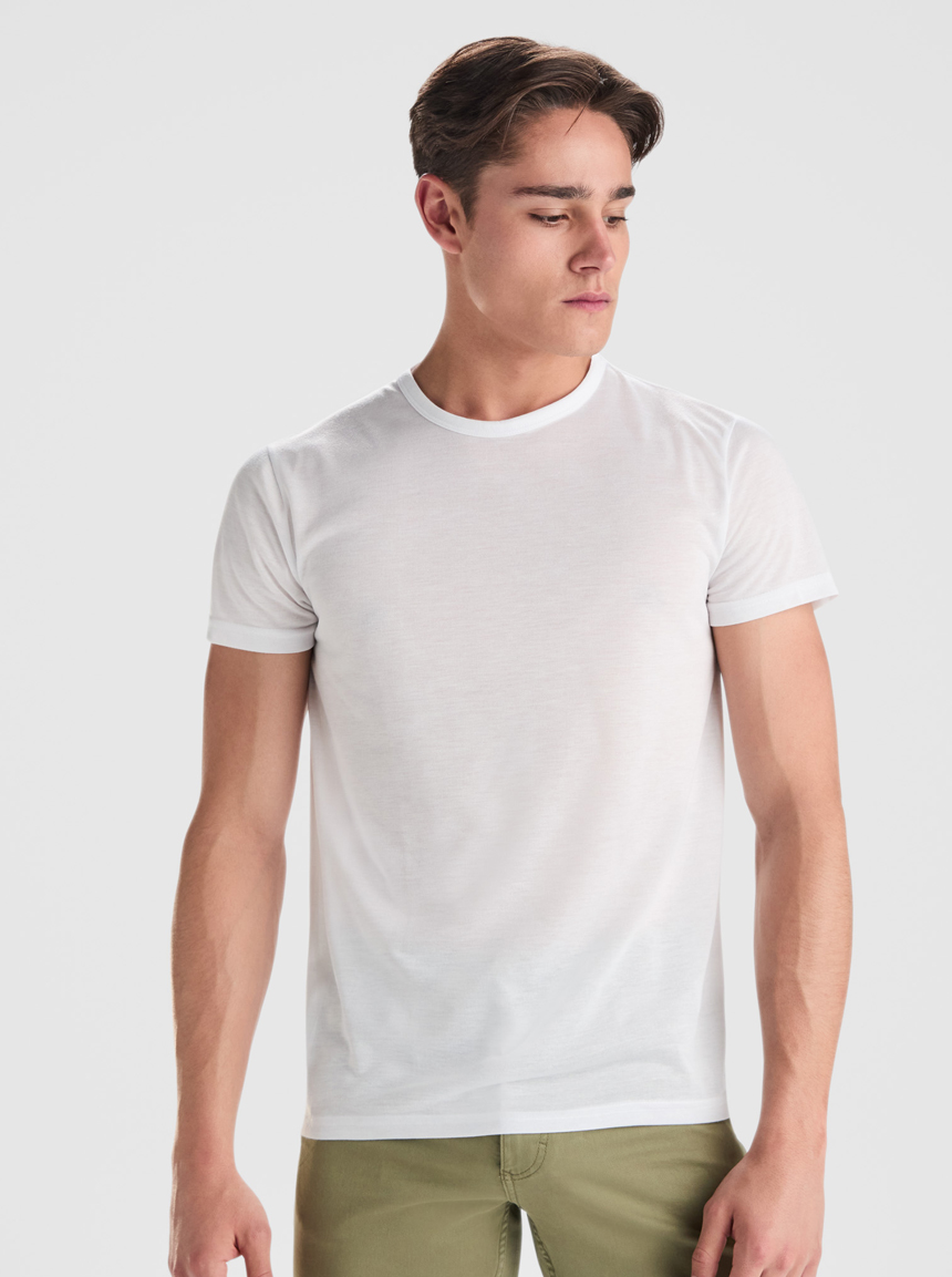 Тениска с къс ръкав с оребрено деколте от същия плат и странични шевове.