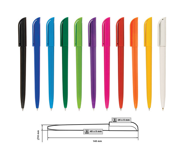 Химикалка, пълнител обикновен. Материал: пластмаса. Размер на артикула: Ø10х140 mm. Печатаемо поле: 45х5 mm. Печатаемо поле клипс: 25х5 mm. Печат: тампонен, ситопечат. Опаковка: 50 бр. в кутия/1000 бр. в кашон. При поръчка, количеството да е кратно на 50 бр.