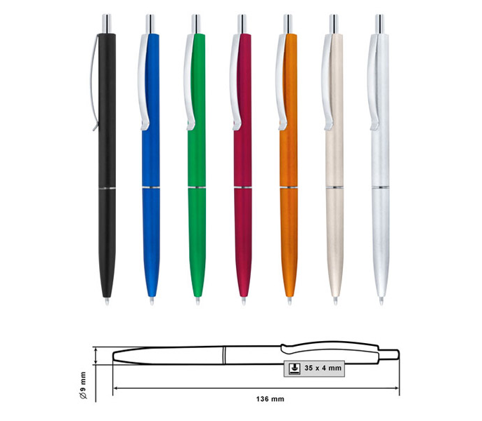 Химикалка, пълнител обикновен. Материал: пластмаса. Размер на артикула: Ø9х136 mm. Печатаемо поле: 35х4 mm. Печат: тампонен, ситопечат. Опаковка: 50 бр. в кутия/1000 бр. в кашон. При поръчка, количеството да е кратно на 50 бр.