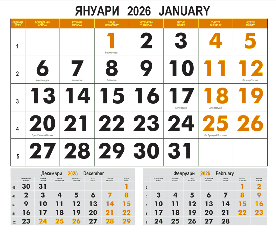 Тетрадка: Oфсет 70 г, печат в 2 цвята, с перфорация и бандерол, български и английски език, прозорче за текущия ден ( НЕ Е ВКЛЮЧЕНО В ЦЕНАТА ) - ПОРЪЧАЙ ТУК . Отбелязани са именните дни и фазите на луната.