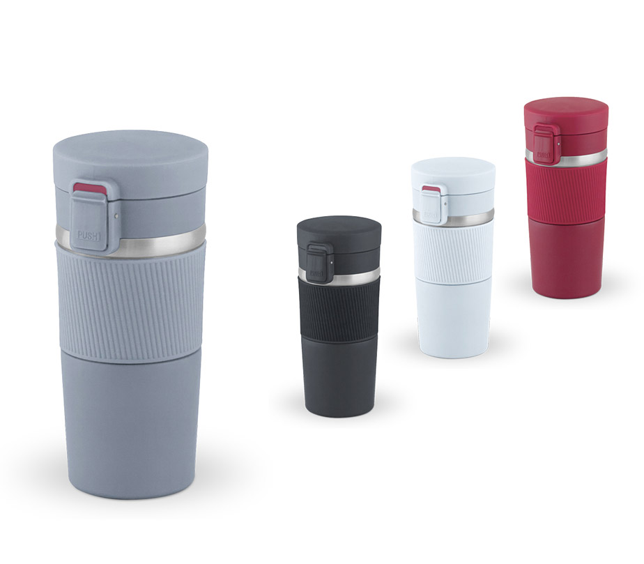 Термо чаша, 400 ml, двустенна, бутон за отваряне, улей за пиене, копче за заключване, вакуумна изолация, пръстен за уплътняване. Материал: неръждаема стомана, пластмаса и силикон. Размер на артикула: Ø75х175 mm. Печатаемо поле: 35х40 mm. Печат: тампонен, ситопечат.