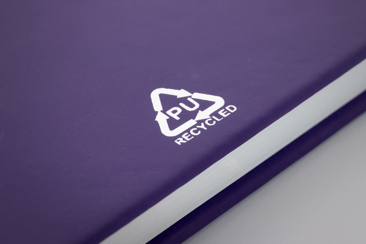 Бележник размер А5 с твърди корици от рециклирана еко кожа със 160 страници на редове от рециклирана хартия. С отметка в съответстващ цвят и ластик.
