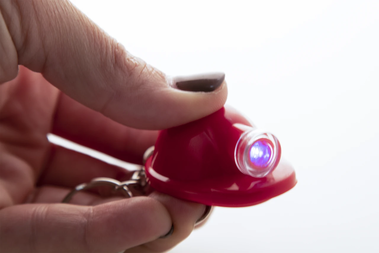Ключодържател във формата на предпазна каска с вградено LED фенерче. Включена е батерия.