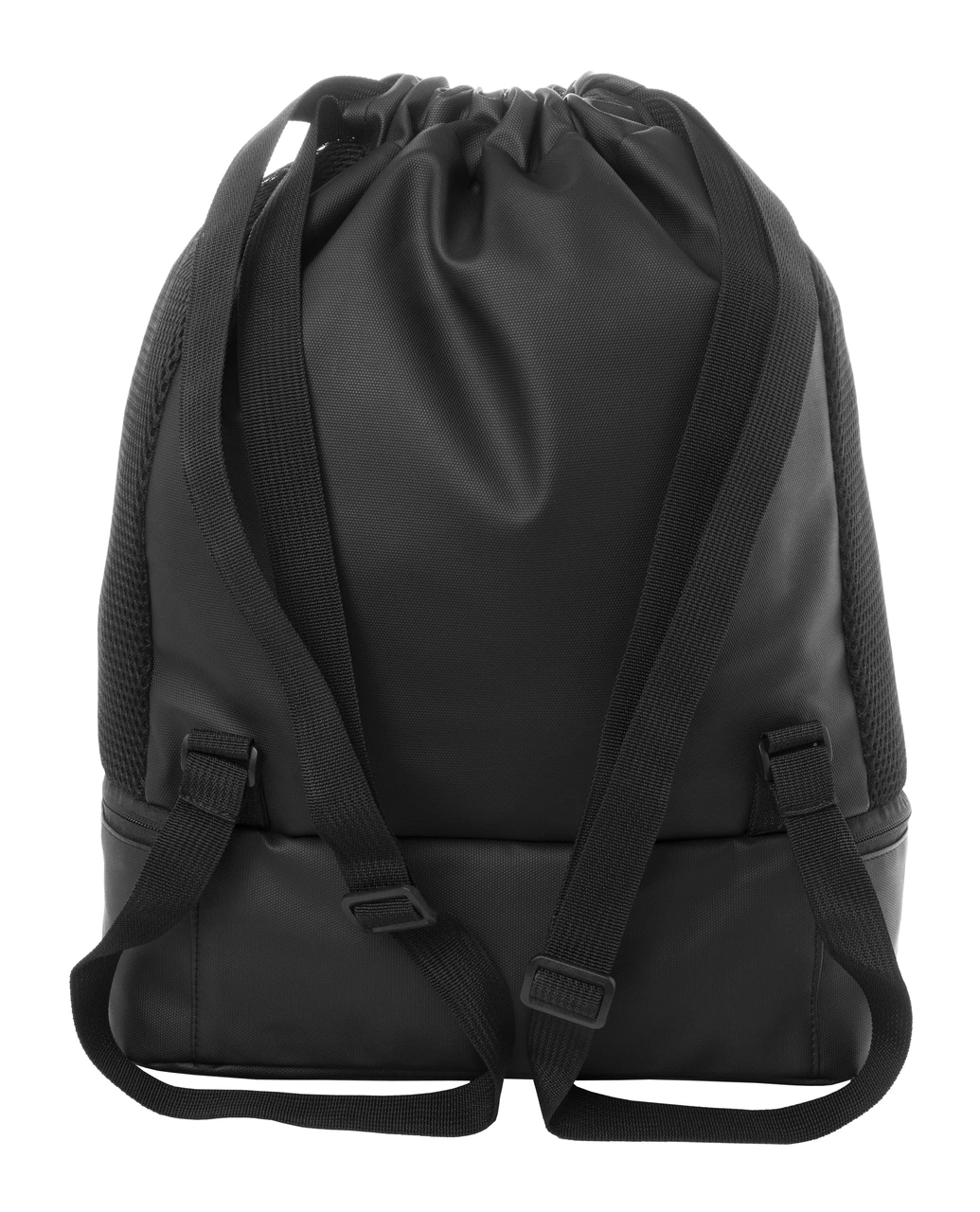 Мешка от рециклиран полиестер (RPET 600D) с покритие от еко кожа. Има отделение за обувки с цип и широки презрамки.
