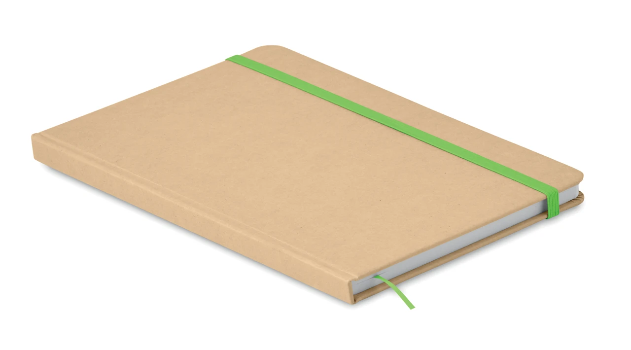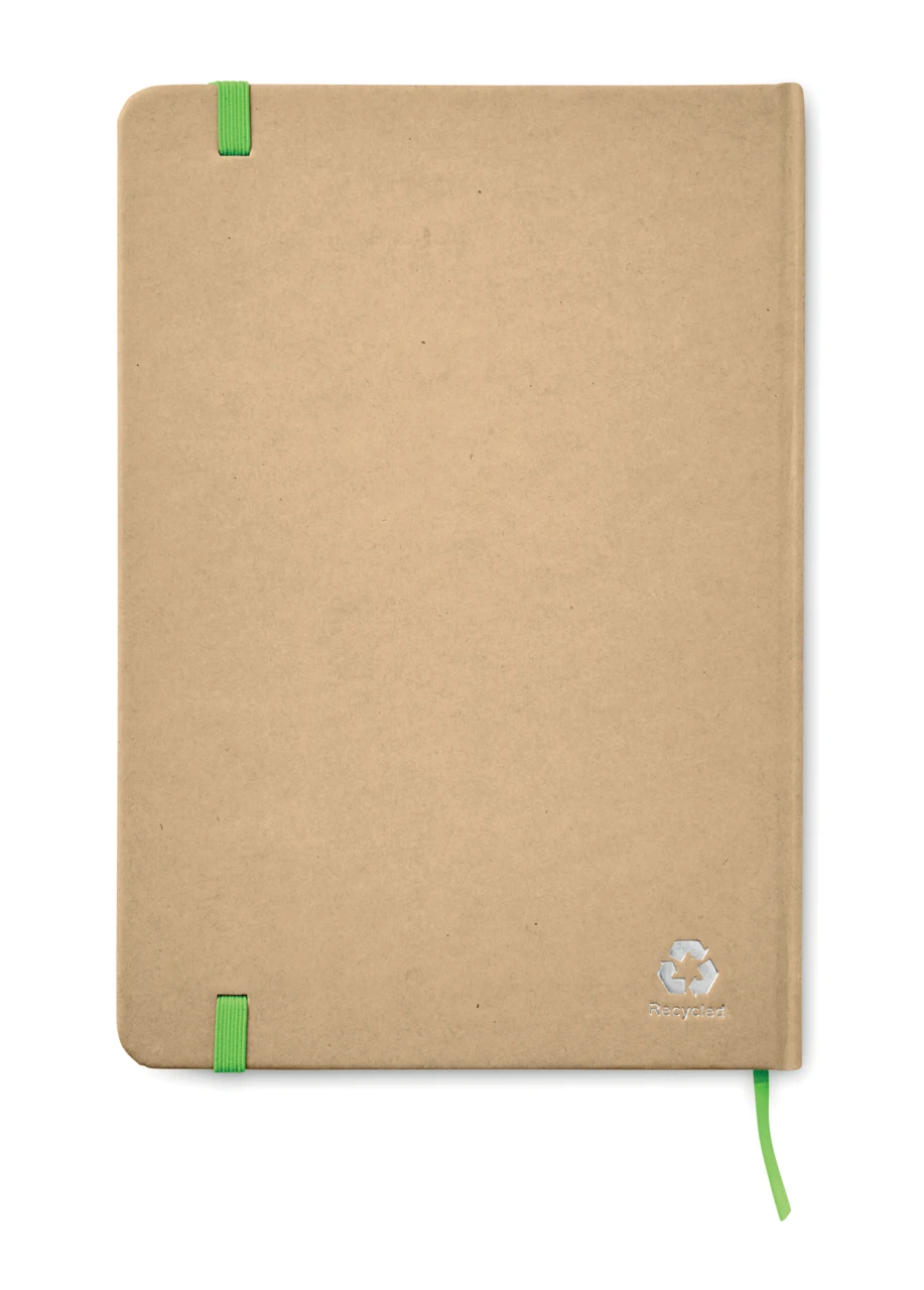Екологичен бележник A5 с твърда корица от рециклиран картон. Съдържа 160 страници (80 листа) с редове, изработени от рециклирана хартия. Включва еластична лента за затваряне и маркираща лента. Перфектен за ежедневни бележки, идеи и записки.