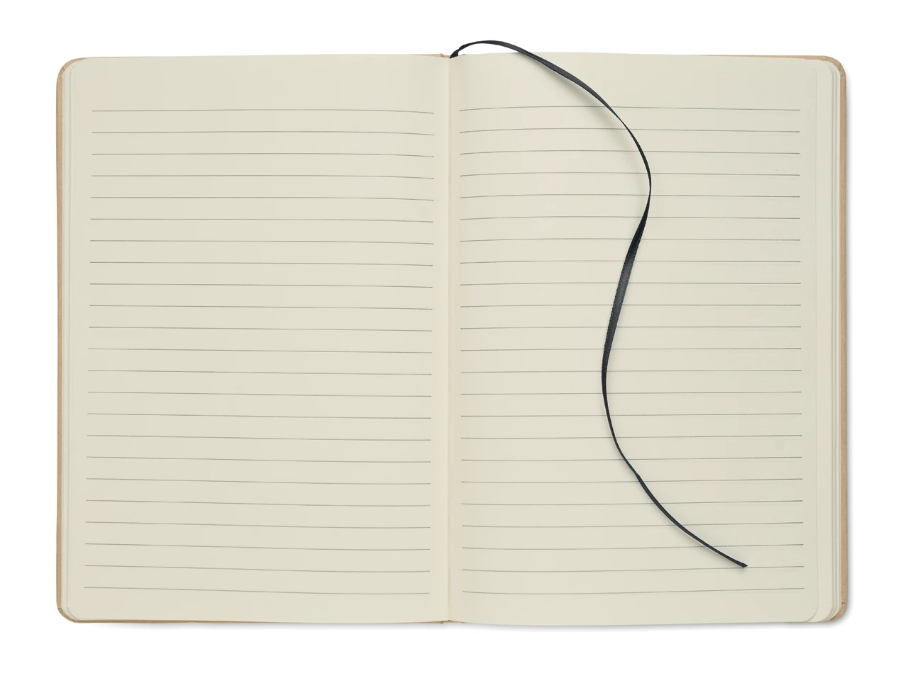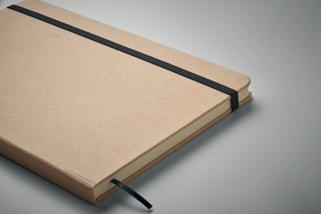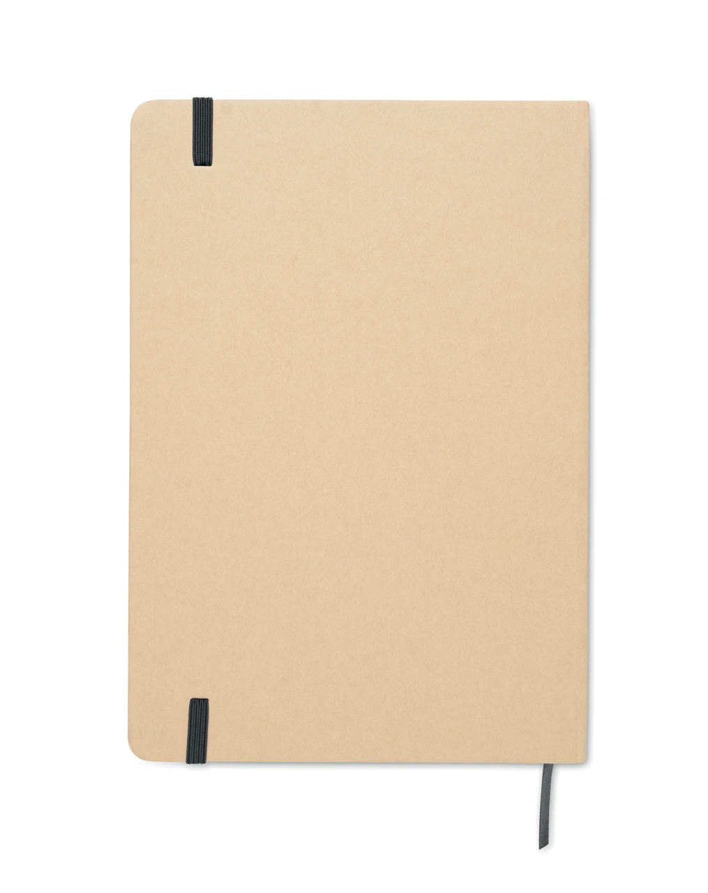 Екологичен бележник A5 с твърда корица от рециклиран картон (бежов цвят). Съдържа 160 страници (80 листа) с редове, изработени от рециклирана хартия. Разкрива цвета си при лазерно гравиране. Включва еластична лента за затваряне и маркираща лента в съответстващия цвят.