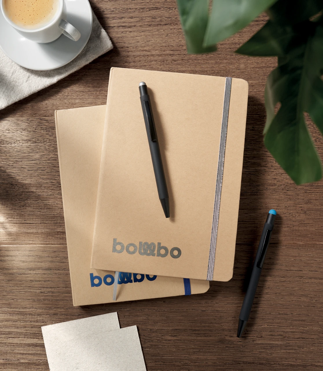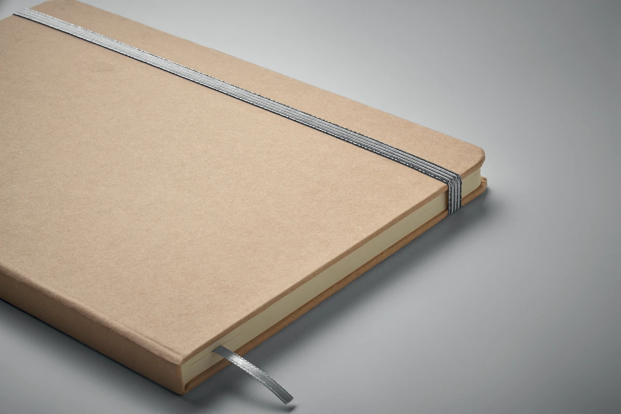 Екологичен бележник A5 с твърда корица от рециклиран картон (бежов цвят). Съдържа 160 страници (80 листа) с редове, изработени от рециклирана хартия. Разкрива цвета си при лазерно гравиране. Включва еластична лента за затваряне и маркираща лента в съответстващия цвят.