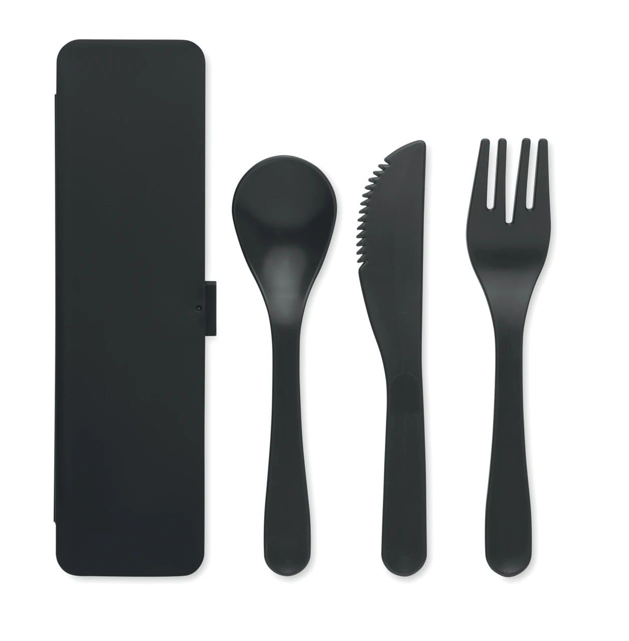 Комплект от 3 прибора от полипропилен (вилица, нож и лъжица) с кутия в съответстващ цвят.
