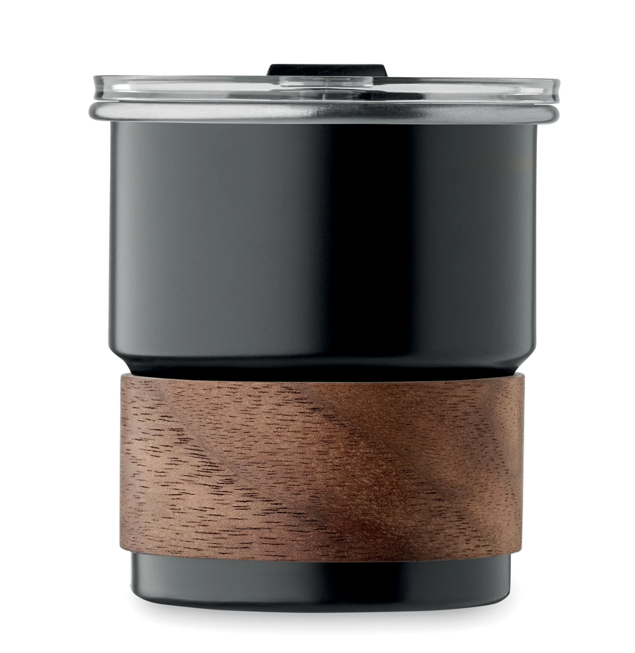 Едностенна чаша от неръждаема стомана с подвижен захват от акациево дърво и сламка от неръждаема стомана. Място за сламка и директен отвор за пиене, непропусклив капак. Вместимост: 260 мл. Тъй като това е едностенна чаша е възможен пренос на топлина.