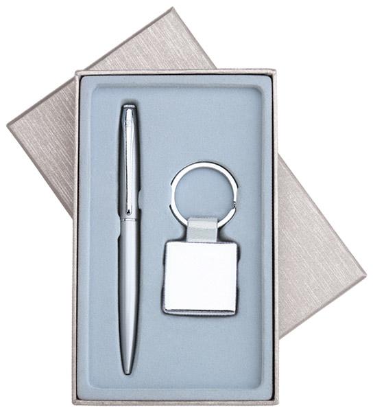 Стилен комплект съчетаващ метална химикалка с ключодържател в красива подаръчна кутия.