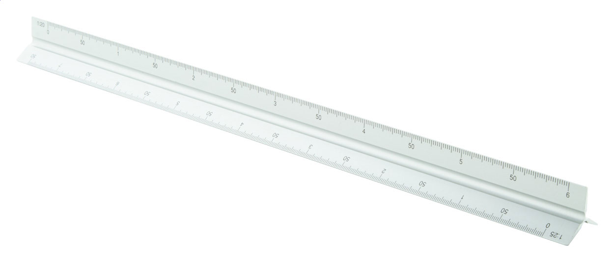 Трилинов скалометър Алуминиев скалометър с триъгълна форма. С 30 см линийка и скали 1:20/1:25/1:50/1:75/1:100.