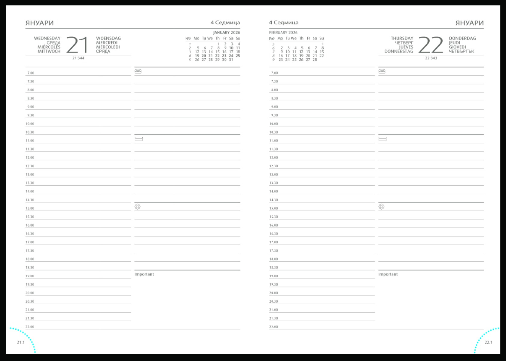 С дати. Мултинационално тяло, осем езика вкл. български, заглавна страница, официални и църковни празници в България и 24 страни. Хартия бял офсет. Текстилна лента за отбелязване. Перфорация на ъглите.