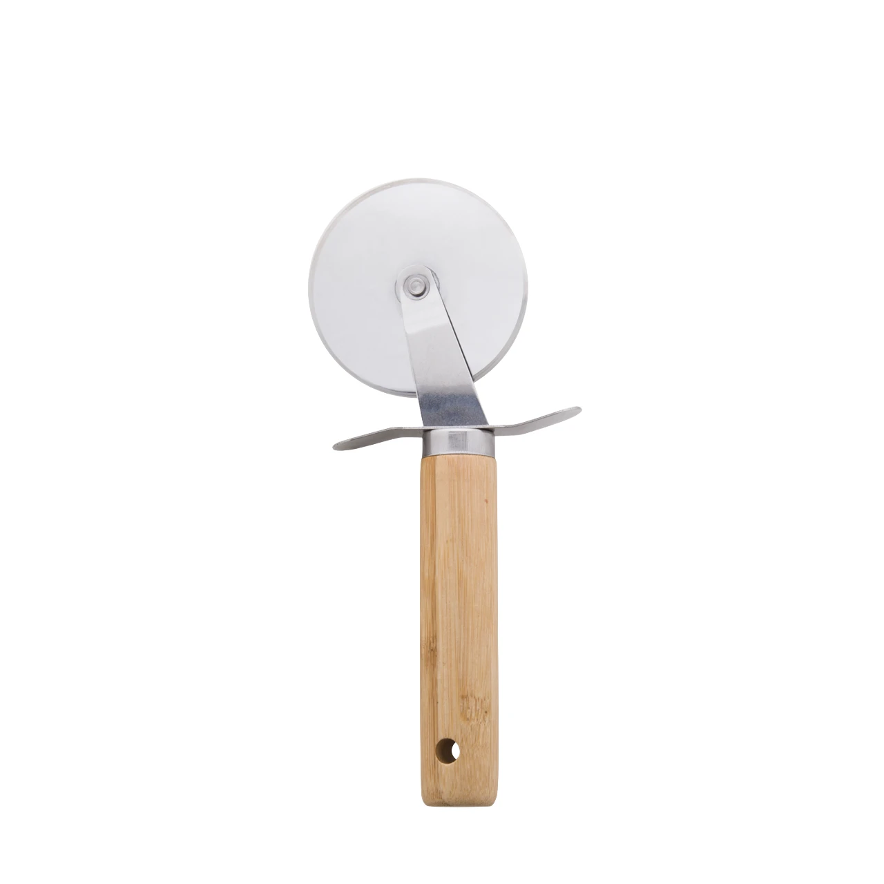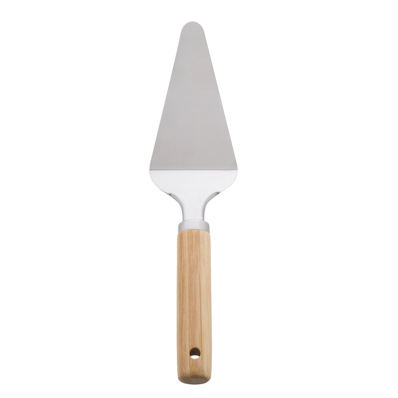 Комплект за сервиране на пица от 3 части от неръждаема стомана с бамбукова дръжка в памучна торбичка. Включва ренде за сирене, нож за пица и шпатула.