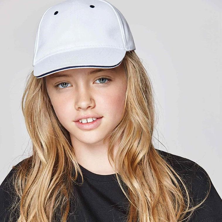 Детска шест панелна шапка с контрастен ръб на козирката и шест бродиране вентилационни отвора. Шапката е тип сандвич и е с велкро закопчалка.