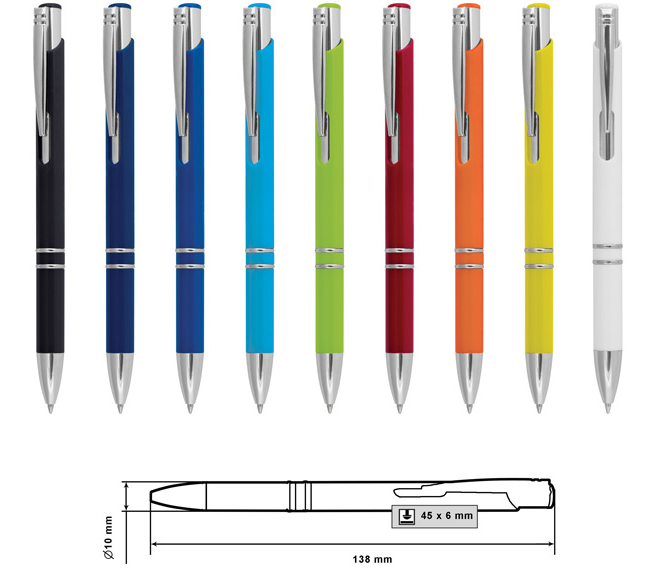 Химикалка, пълнител тип паркер. Материал: пластмаса. Размер на артикула: Ø10х138 mm. Печатаемо поле: 45х6 mm. Печат: тампонен, ситопечат. Опаковка: 50 бр. в кутия/1000 бр. в кашон. При поръчка, количеството да е кратно на 50 бр.